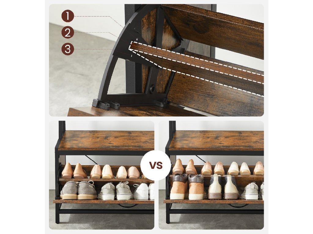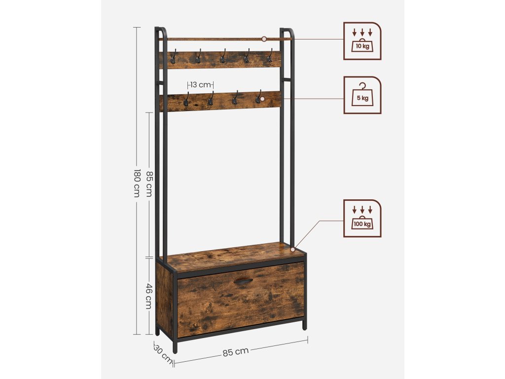 Többé nincs szükség szanaszét hagyott cipőkre vagy kabátokra! Ez a multifunkcionális fogas paddal és cipősszekrénnyel rendet és stílust hoz az előszobába. A fém és a rusztikus barna forgácslap kombinációjának köszönhetően egyszerre elegáns és modern. Az akasztók kabátok, táskák vagy hátizsákok felakasztására szolgálnak, a lenyíló cipősszekrény akár két sor cipőt is elrejt, és a felső polc dekorációk vagy kulcsok számára kínál helyet. A pad elég szilárd, hogy kényelmes ülést biztosítson cipőfelhúzás közben. Kiváló választás mindenkinek, aki értékeli a praktikusságot a dizájnos kialakításban.