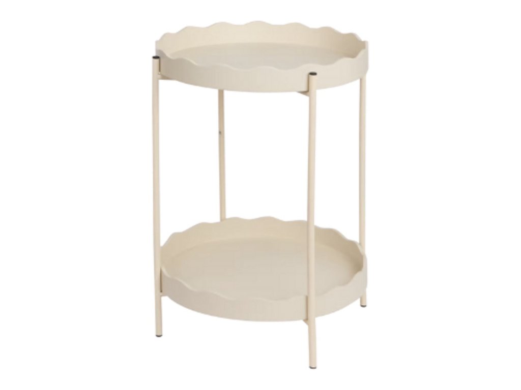 Kisasztal RAVELO Ø 40,5 cm, bézs színű lenyűgöző a szimpla fém kialakításával és a hangsúlyos, hullámos szélével mindkét lerakófelületen. 40,5 cm átmérője és kétszintes kivitele elegendő helyet biztosít a tároláshoz anélkül, hogy túl sok helyet foglalna el. Remekül illik a kanapé mellé, hálószobába vagy előszobába. Finom színe és letisztult dizájnja egyszerű kombinálást tesz lehetővé természetes anyagokkal, pasztellszínekkel, valamint a skandináv vagy modern stílusokkal.