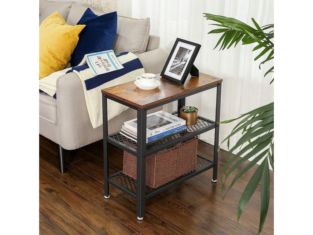 Kompakt formája és praktikus kialakítása révén ez az asztal nélkülözhetetlen társává válik bármelyik szobában. Ideális helyet kínál könyvek, kávéscsésze vagy dekorációk elhelyezésére, míg az alsó fém polcok áttekinthető tárolást biztosítanak magazinok, kosarak vagy elektronikai eszközök számára. A fa és a fém kombinációja indusztriális hatást kölcsönöz a belső térnek, és könnyen illeszkedik a különböző stílusú berendezésekhez. Használja az asztalt a kanapé mellett, az előszobában vagy éjjeli szekrényként – a lehetőségek számtalanok.