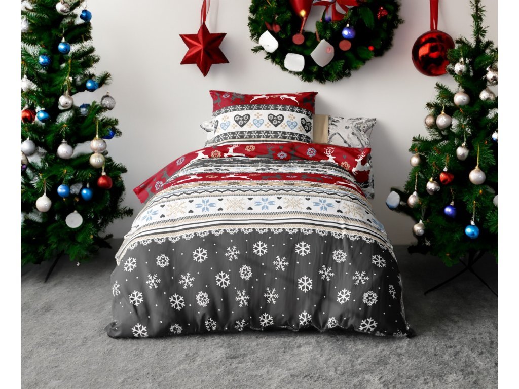 KARÁCSONYI SZARVAS piros flanel ágynemű + SOFT sötétszürke mikroplüss lepedő 90x200 cm