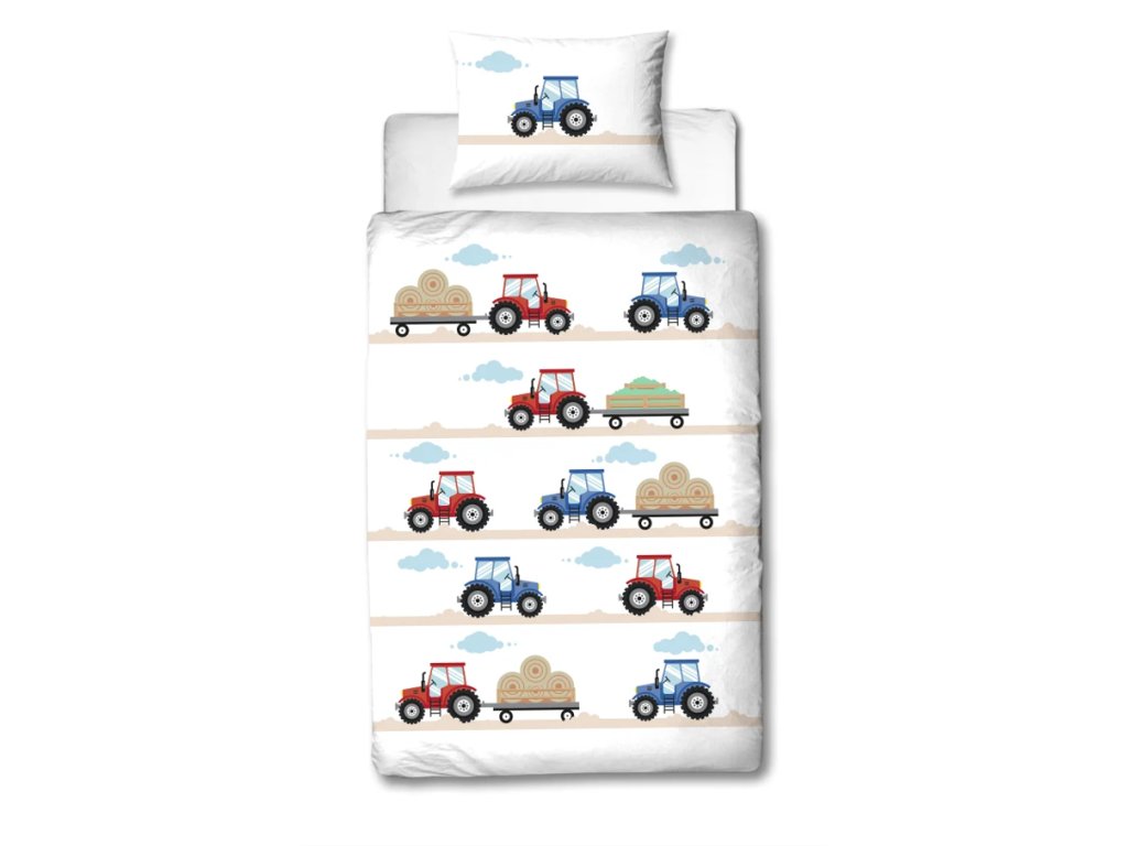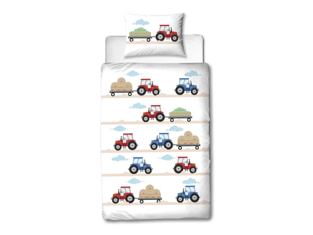 A Gyerek flanel ágynemű TRAKTOR játékosságot és kényelmet hoz a gyerekszobába. A fehér alapon kiemelkednek a piros és kék traktorok színes motívumai, amelyek elbűvölik a kis mezőgazdasági gépek szerelmeseit.