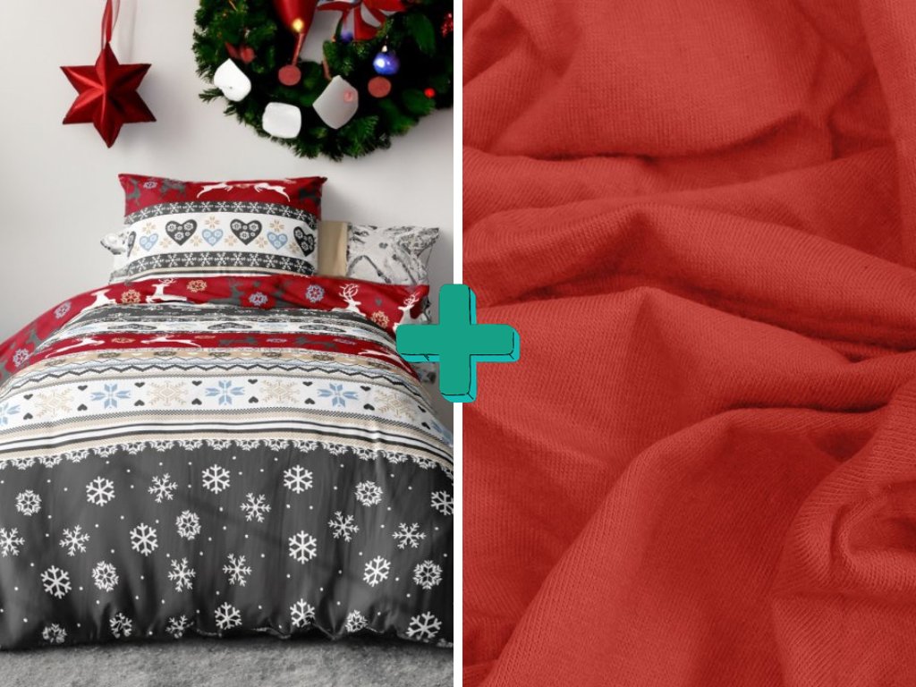 KARÁCSONYI SZARVAS piros 2db flanel ágynemű + JERSEY EXKLUZÍV piros lepedő 180 x 200 cm