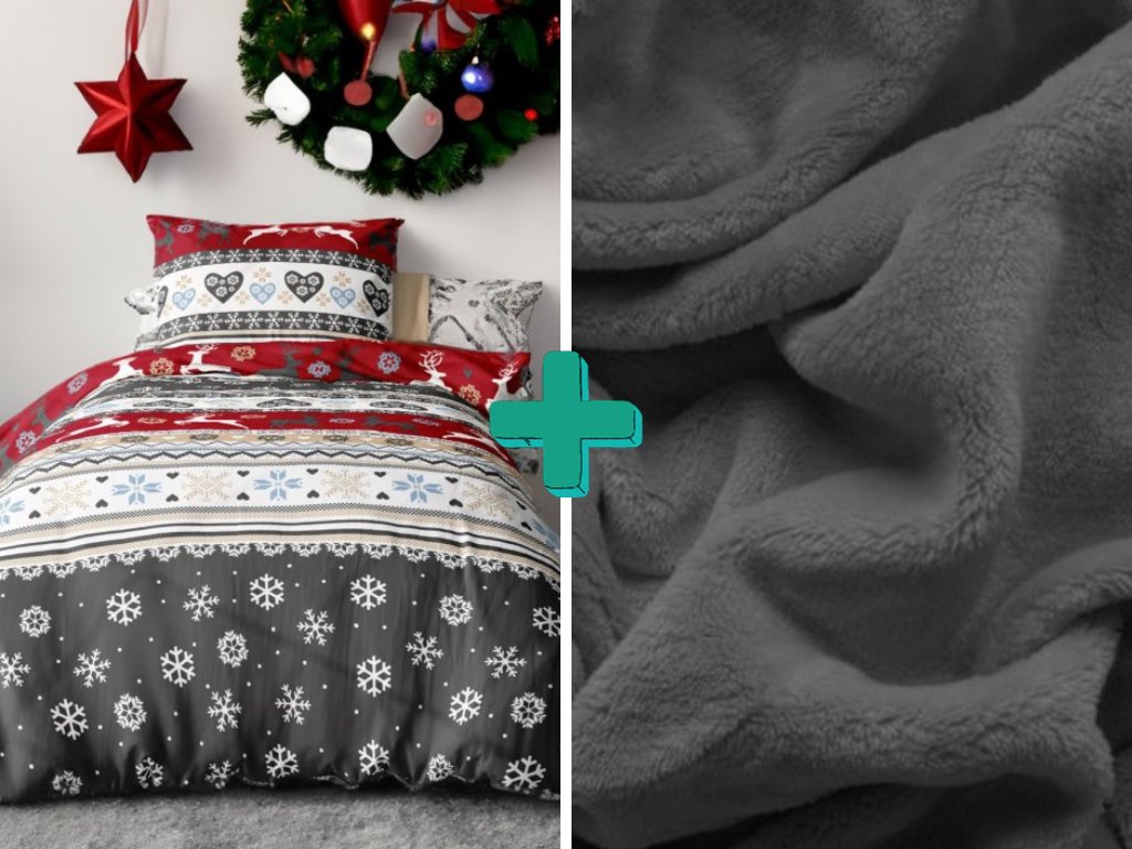 KARÁCSONYI SZARVAS piros 2db flanel ágynemű + SOFT sötétszürke mikroplüss lepedő 180x200 cm