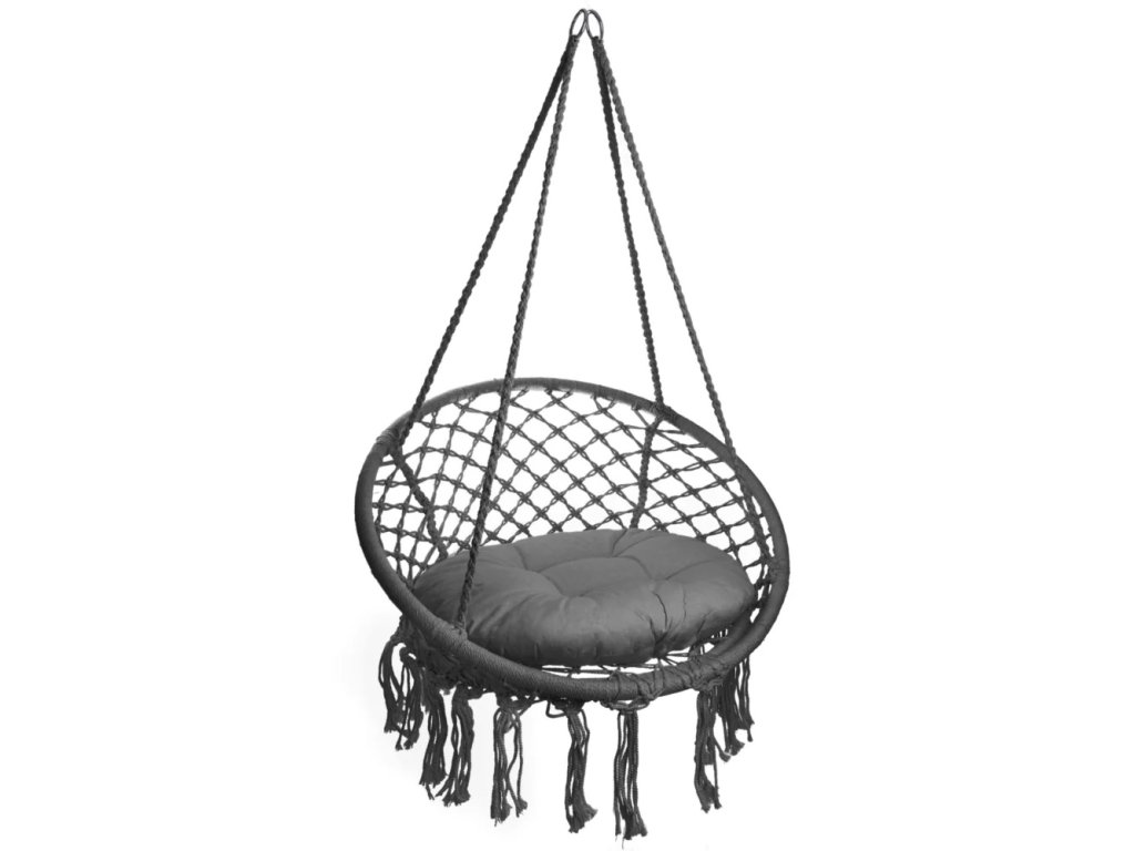 A Sötétszürke KOLUMBIA függőszék elegáns szürke színben stílusos kiegészítő otthoni és kültéri pihenéshez. Az erős fonott kialakításnak és a puha, kerek párnának köszönhetően kényelmes ülést és finom ringatást kínál, ami ellazítja a testet és az elmét. A sűrűn fonott kötél oldalsó rojttal finom dekoratív megjelenést és egyúttal tartósságot kölcsönöz a széknek.