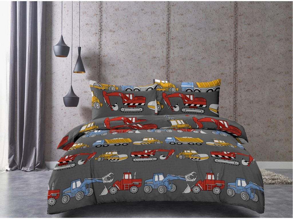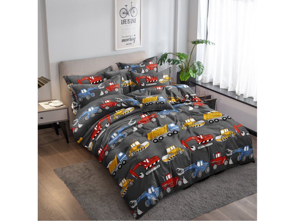 AZ ÉPÍTŐGÉPEK szürke gyermekágynemű nem feltűnő cipzárral záródik. Tedd boldoggá gyermekeidet eredeti motívumú ágyneművel.