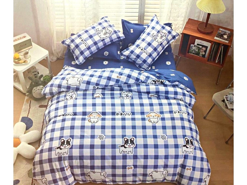 KOCKÁS KUTYA kék pamut baba ágyneműhuzat