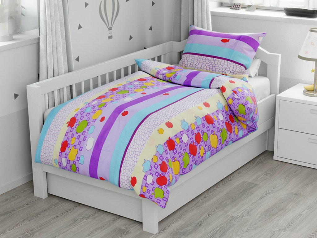 SZÍNES CSÍKOK ALMÁVAL lila pamut baba ágyneműhuzat