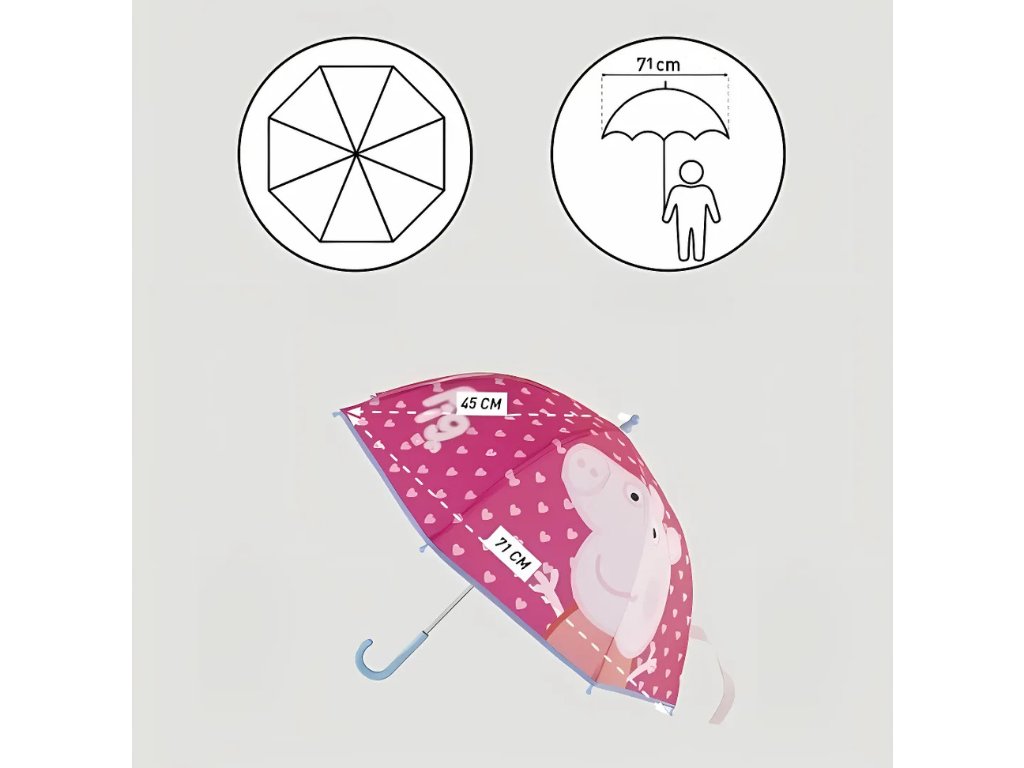 A Peppa malac vidám dizájnja rózsaszín színben remekül kiegészíti a mesehős rajongóinak öltözékét. Ez az esernyő nemcsak praktikus segítő lesz, hanem divatos kiegészítő is, amely minden időjárásban örömet szerez a gyerekeknek.