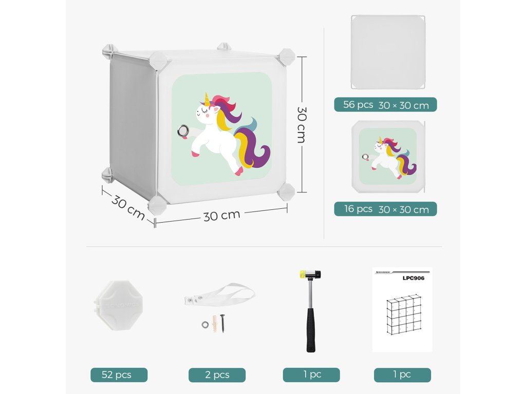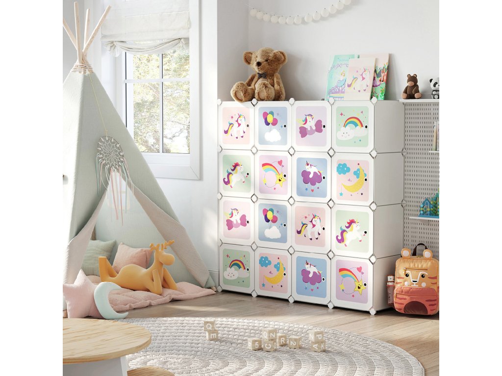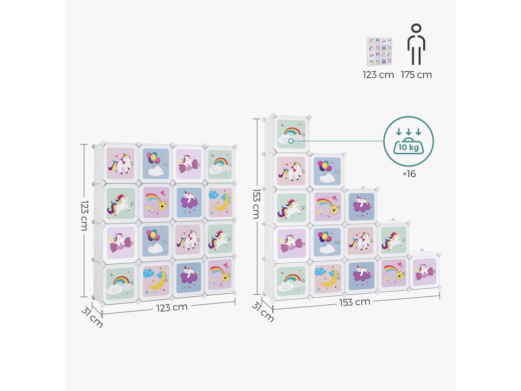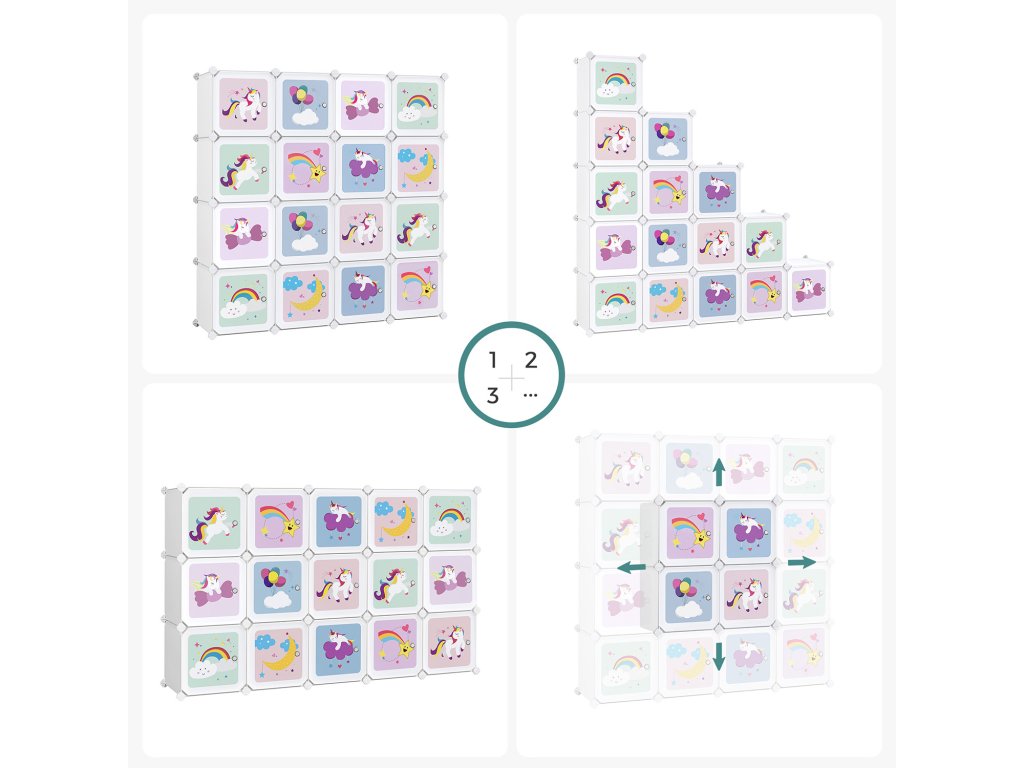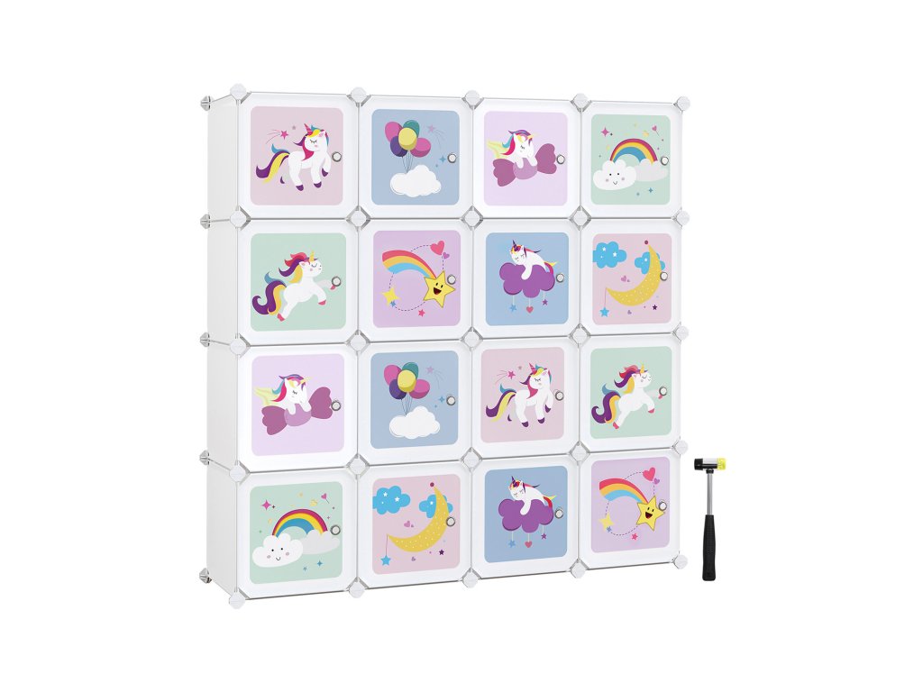 Gyerek moduláris szekrény UNICORN varázslatos légkört hoz a gyerekszobába, tele egyszarvúakkal, felhőkkel és szivárvánnyal. A fehér műanyag felület vidám motívumokkal minden gyermeket elbűvöl és a játékok, könyvek vagy ruhák elpakolását szórakozássá varázsolja. Az egyes elemek könnyűek, de erősek, mindegyik teherbírása akár 10 kg.