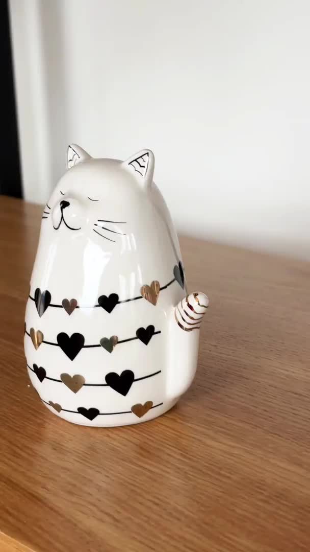 Kerámia macska szívecskékkel LOVELY CAT 13 cm fehér egy bájos és elegáns kiegészítő, amely fehér kialakításával, fekete és arany dekoratív szívecskékkel vonzza a tekintetet. Ez a stílusos kialakítás modern megjelenést kölcsönöz a dekorációnak, és nagyszerű választás az eredeti lakberendezési kiegészítők szerelmeseinek.