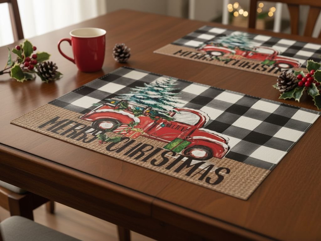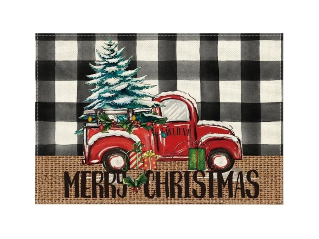 Karácsonyi asztali terítő MERRY CHRISTMAS 30 x 45 cm méretben, vidám piros teherautós motívummal, ajándékokkal és karácsonyfával díszíti fel az ünnepi asztalt. A jutahatású megjelenés, a fekete-fehér kockák és a hagyományos karácsonyi nyomtatás kombinációja barátságos, meghitt légkört teremt.