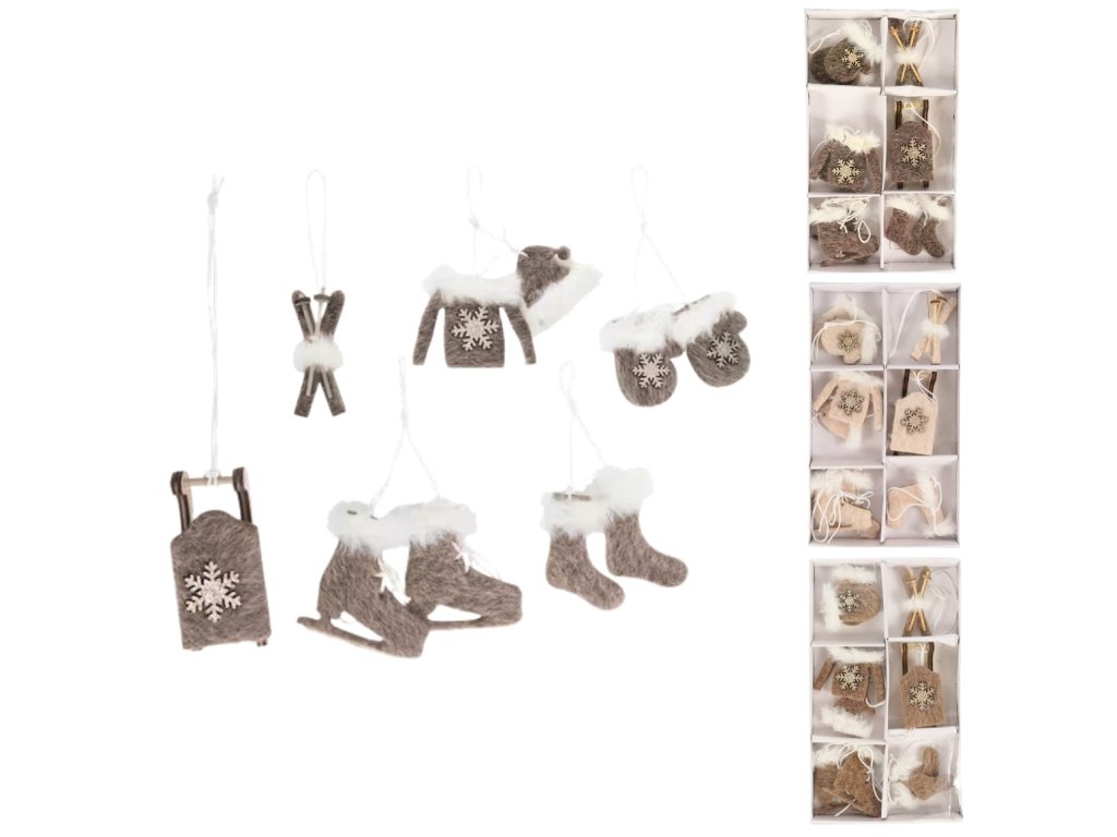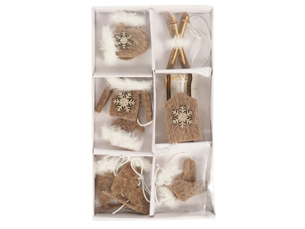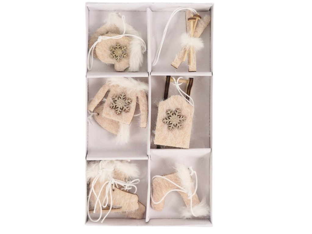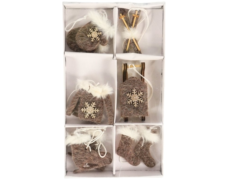 Adja meg karácsonyfájának a varázst ezzel a Karácsonyi függődísz szett CHRISTMAS SYMBOLS 6 db - több színben, finom barna vagy bézs árnyalatokban. A szett tartalmaz 6 aranyos téli szimbólumot, mint például korcsolya, szánkó, kesztyű vagy síléc, amelyeket puha szőrmével és hópehely motívummal egészítettek ki. Ezek a díszek azonnal kellemes karácsonyi hangulatot teremtenek.