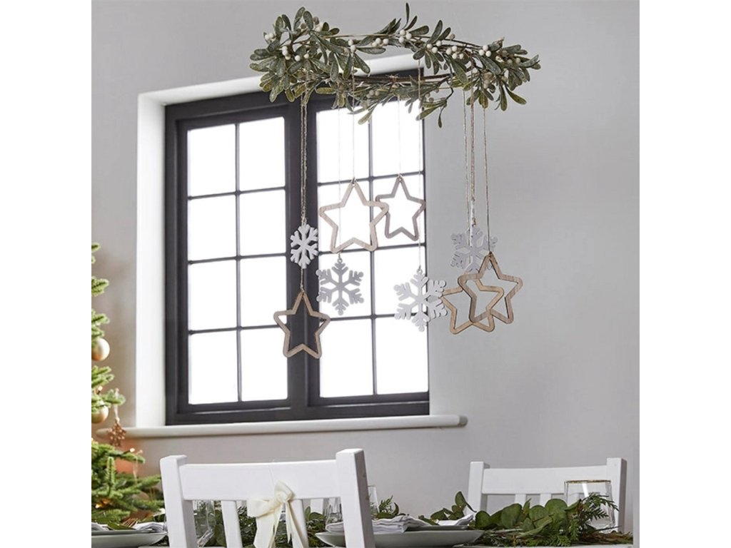- A készlet tartalma: 1 koszorú mű magyallal, 5 fehér fa hópehely és 5 fa csillag