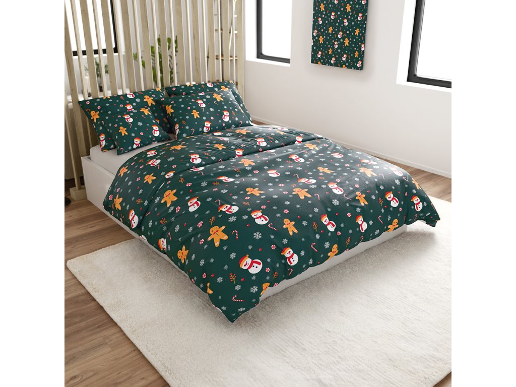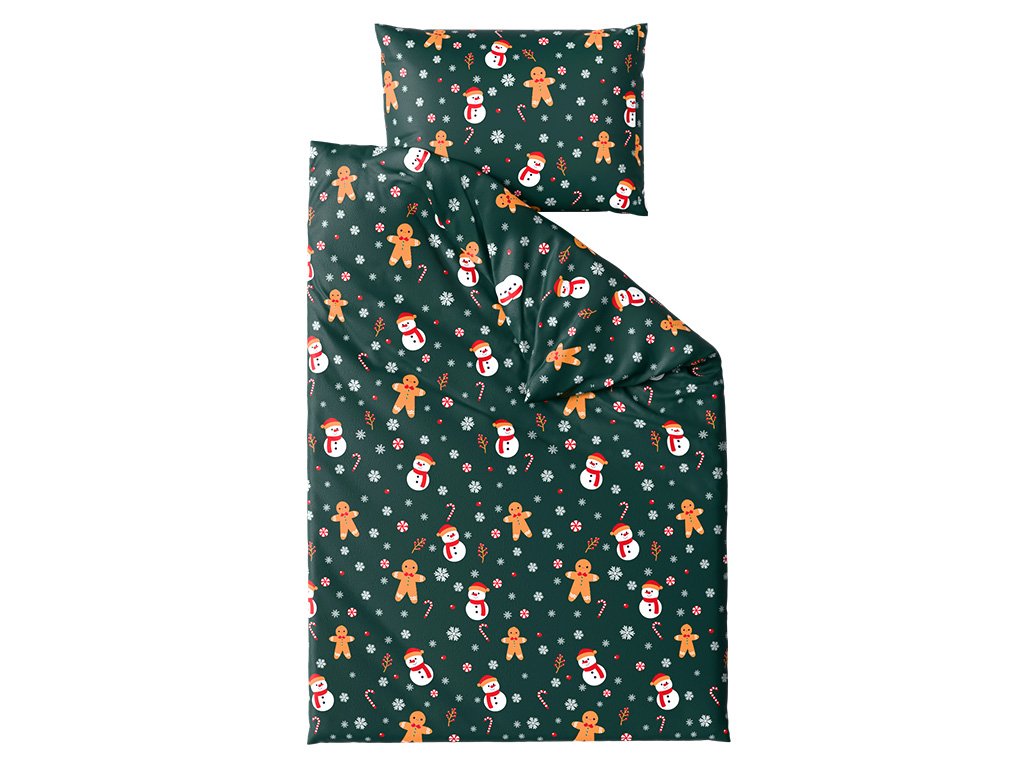 Mikroplüss ágyneműhuzat szett SNOWMAN AND GINGERBREAD zöld + mikroplüss lepedő SOFT 90x200 cm fehér, egyszemélyes ágyhoz