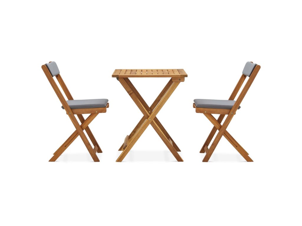- 1x összecsukható asztal, 2x összecsukható szék, 2x ülőpárna, 2x hátpárna