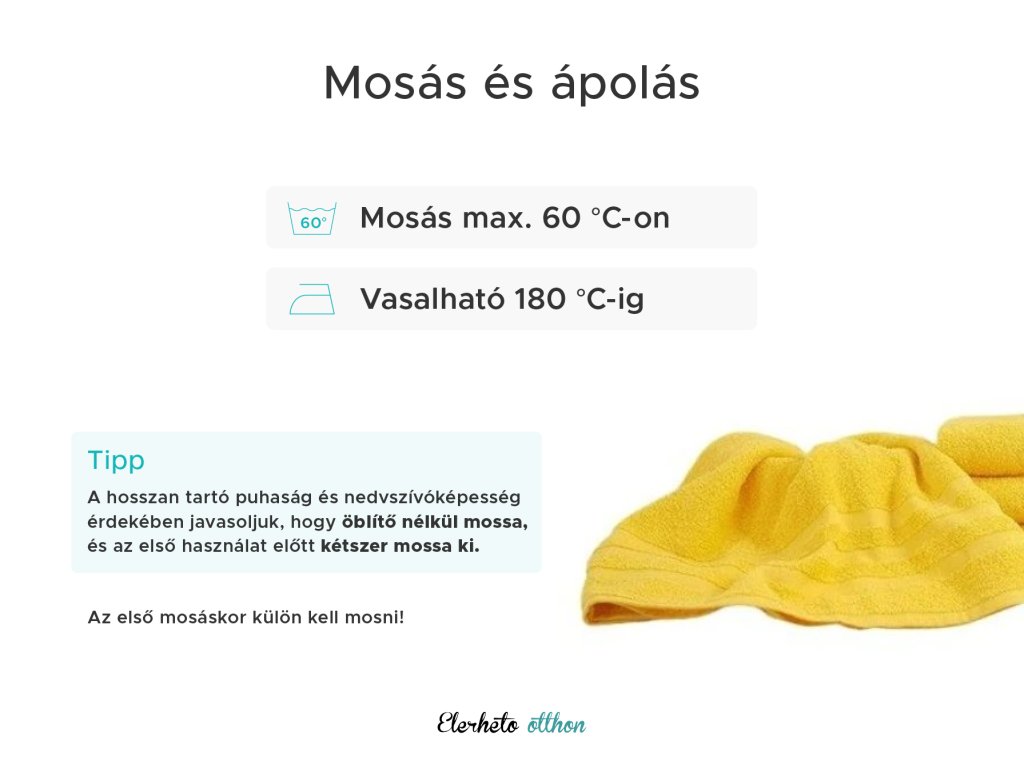 Ajánlásunk: Az optimális nedvszívás és pihe-puhaság érdekében javasoljuk a törölközők és fürdőlepedők első használat előtti kétszeri mosását öblítő használata nélkül maximum 60 °C-on.