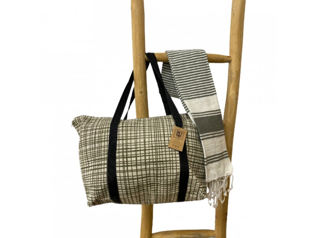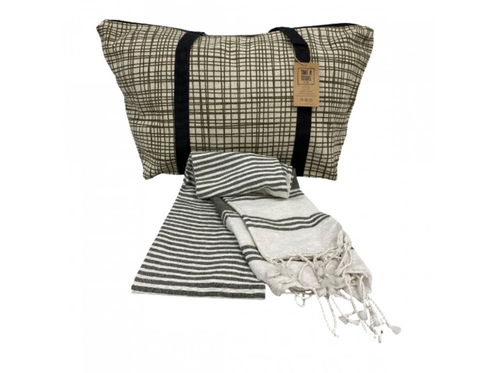 Stílusos szett strandtáska + törölköző HAMAM 75x150 cm, khaki, 100% organikus pamut