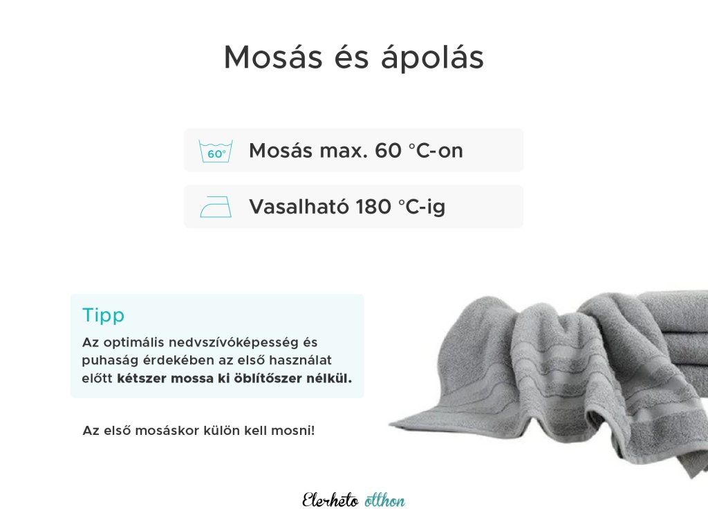 Tip: Az optimális nedvszívás és a szálak bolyhosságának érdekében javasoljuk, hogy a törölközőket és fürdőlepedőket az első használat előtt kétszer mossák ki, öblítőszer nélkül, legfeljebb 60 °C-on.