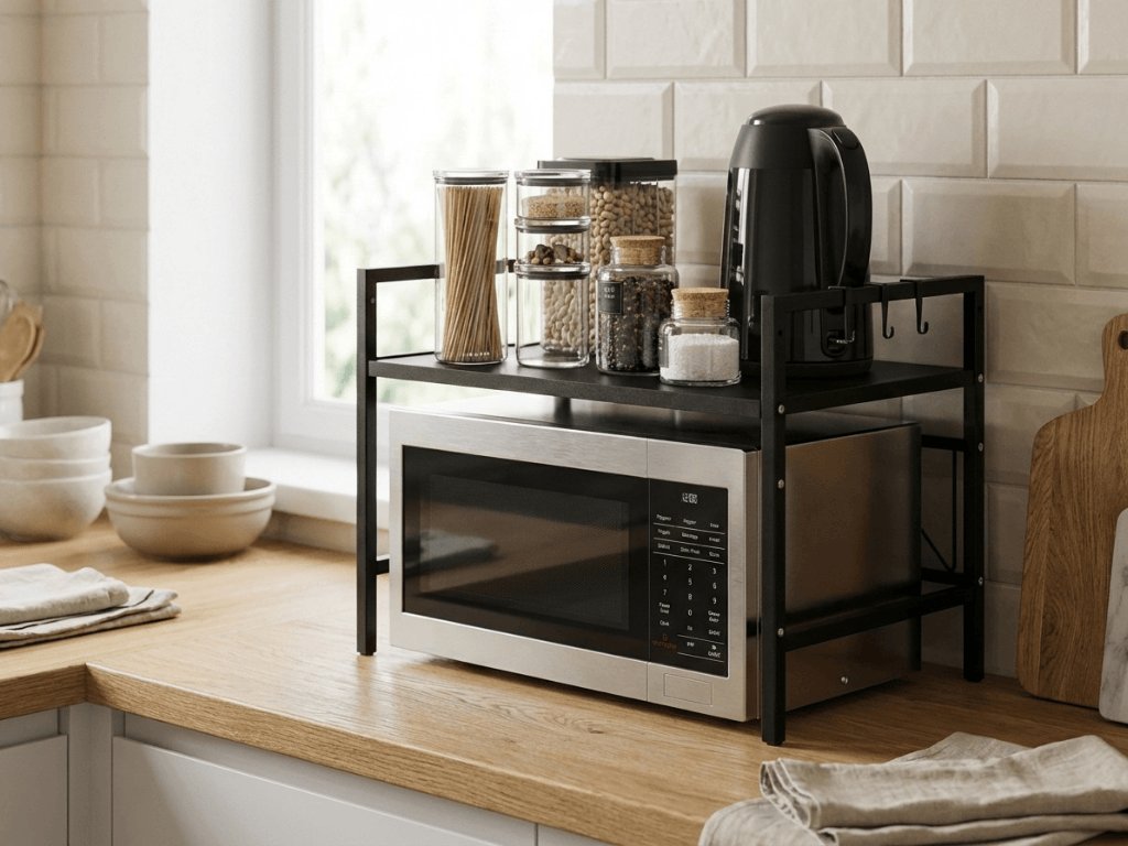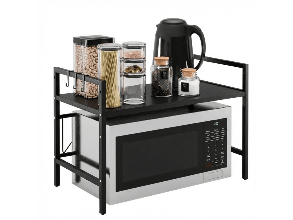 Praktikus konyhai polc segít maximálisan kihasználni a teret a mikrohullámú sütő felett, és tartani a munkafelszínt átláthatóan. Ideális helyet kínál fűszertartóknak, ételdobozoknak vagy kisebb konyhai eszközöknek, amelyeket így mindig kéznél tart. Az állítható kialakításnak köszönhetően könnyen alkalmazkodik a különböző méretű eszközökhöz, és mindennapi főzéshez és a konyha szervezéséhez is észrevétlen, de nagyon hasznos segítőtárssá válik.