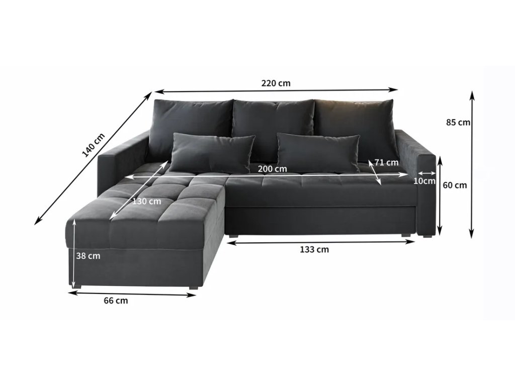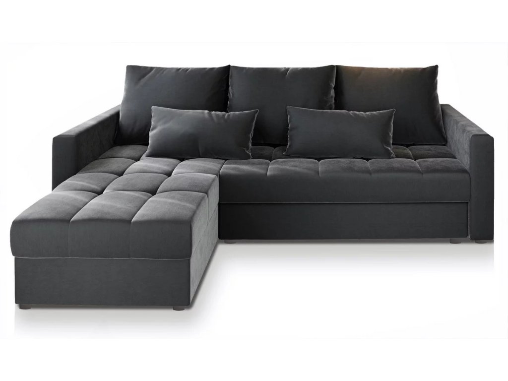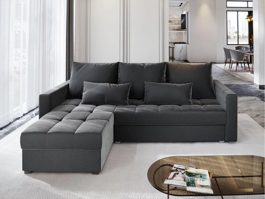 Akció sötétszürke kinyitható sarokkanapé ZENOVA tökéletes elegancia, kényelem és praktikum ötvözete. A univerzális kialakításának köszönhetően választható, hogy melyik oldalra kerüljön a sarok, így minden belső térhez rugalmas választás. A kanapé hátsó része kárpitozott, így szabadon elhelyezhető. Ezen kívül tágas tárolóhellyel rendelkezik, könnyen ágyként kihúzható, és három háttámlával és két díszpárnával van ellátva, amelyek fokozzák a komfortérzetet.