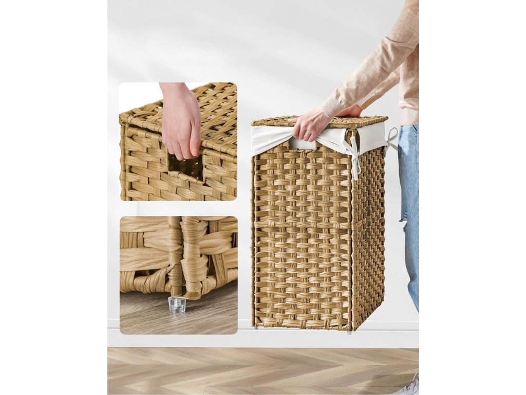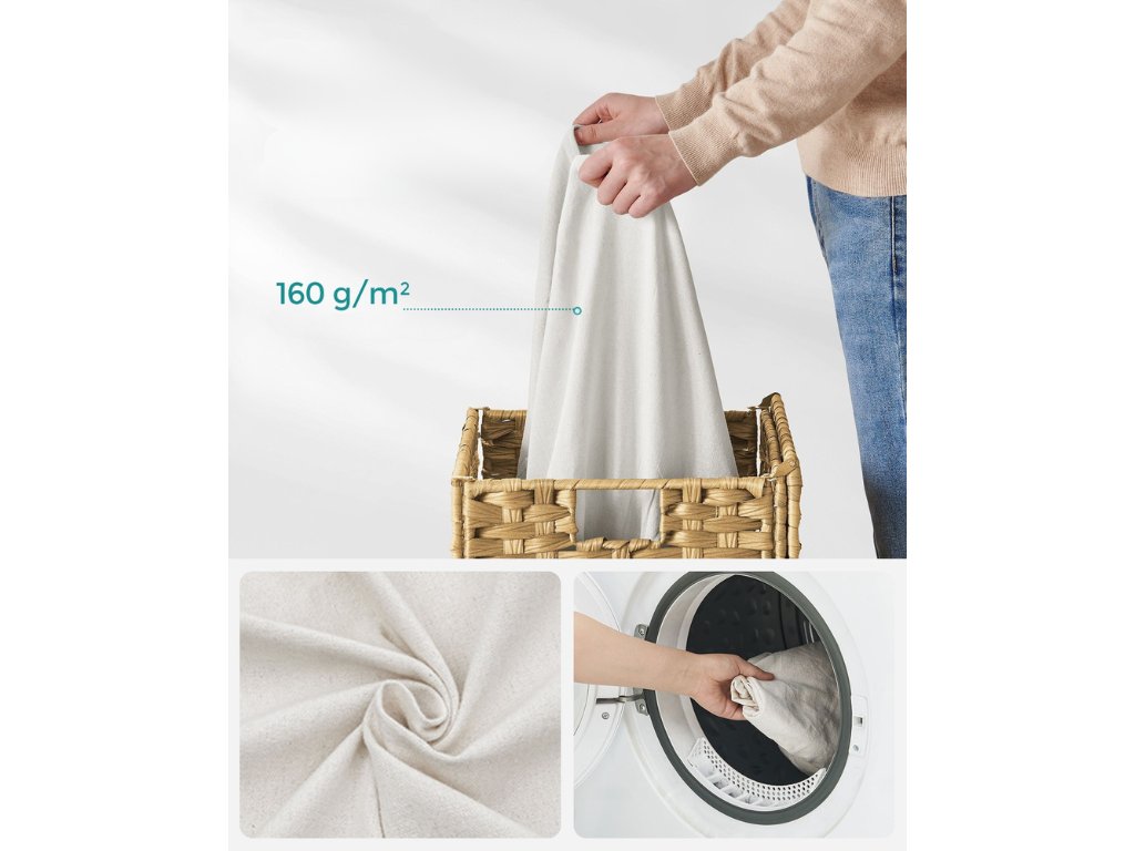 Ez a stílusos szennyestartó ötvözi a természetes designt a praktikus funkciókkal, amelyek megkönnyítik a mindennapi életet. A bézs műrattan kialakítás és a fém keret modern és elegáns megjelenést kölcsönöznek, míg a kivehető textilzsák egyszerű karbantartást és mosási lehetőséget biztosít. Praktikus fogantyúk és könnyű szerkezet révén egyszerűen mozgatható, és az átgondolt, légáramlást biztosító designnal a ruhák mindig frissek maradnak. Ez a kosár nemcsak praktikus kiegészítő, hanem esztétikus elem is, amely szépen kiegészíti a fürdőszoba, hálószoba vagy mosókonyha belső terét.