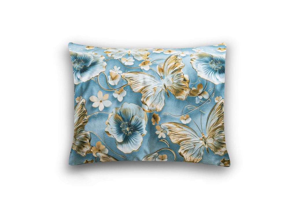 Élvezze az elegancia varázsát a Dekoratív párnahuzat CELESTIA 50 x 70 cm méretű és finom kék színű darabbal. Aranyló tónusú virág- és pillangómintája luxus és nyugalom érzetét kölcsönzi hálószobájának.
