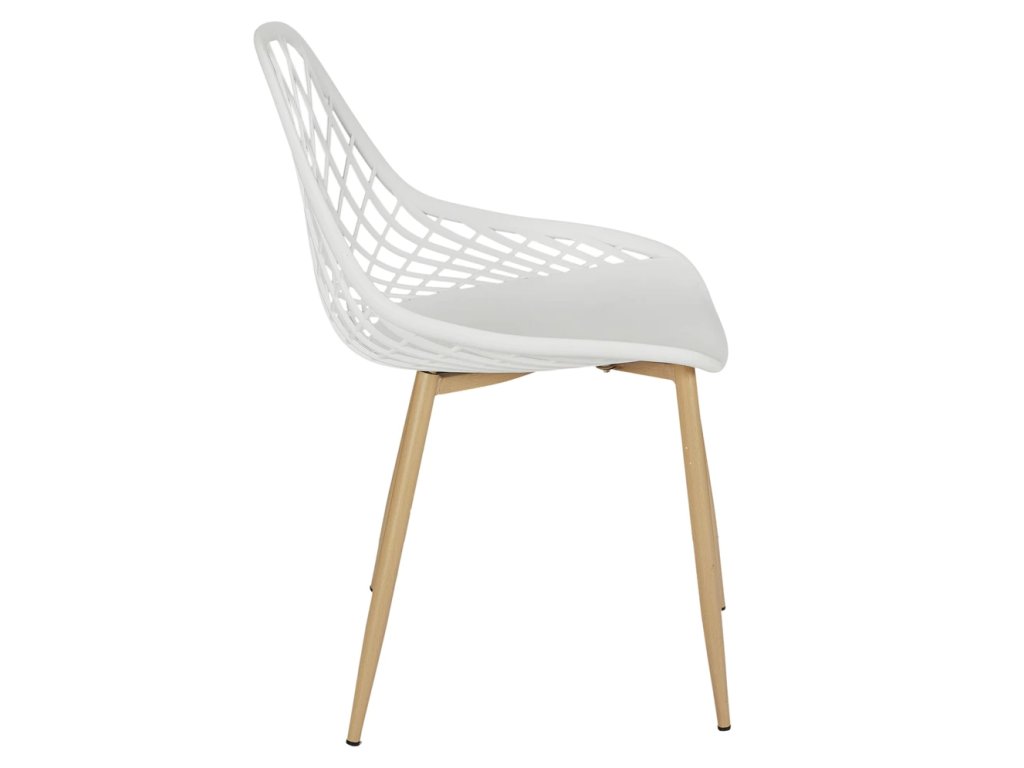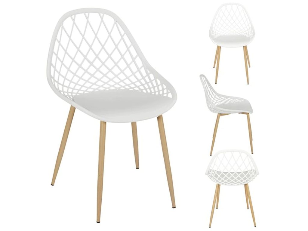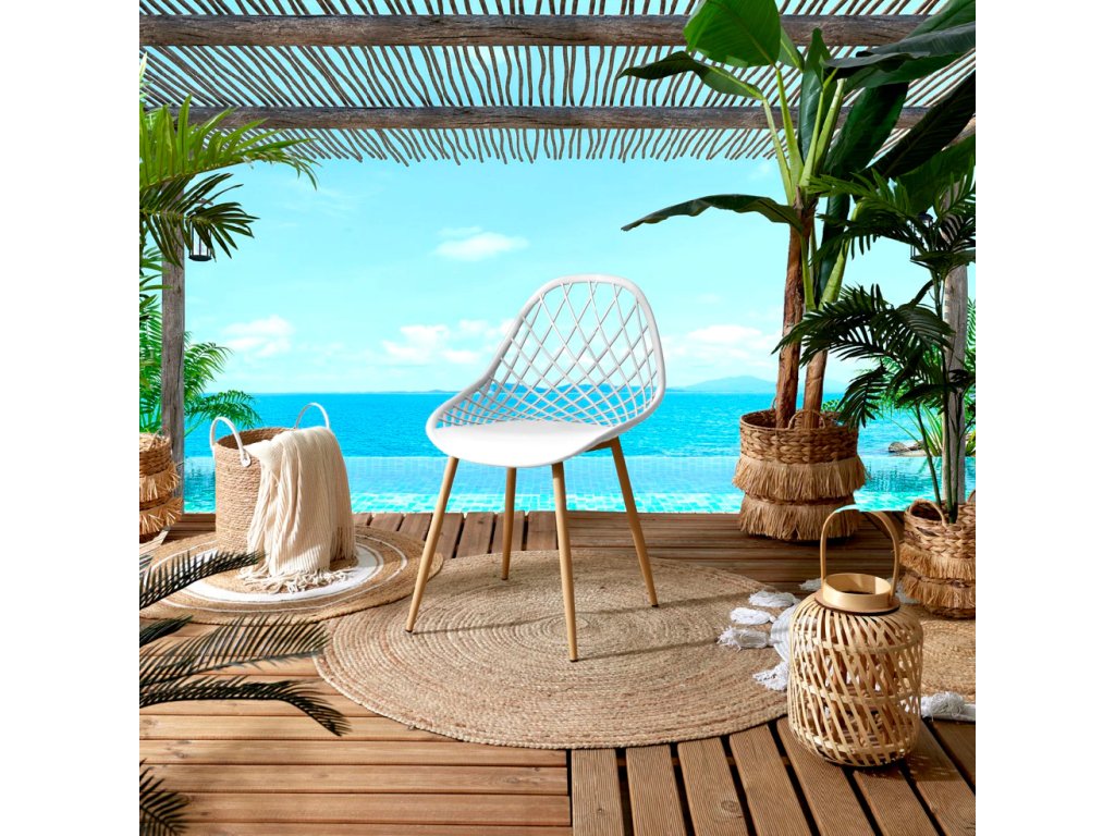 A Fehér étkezőszék MALAGA elegáns fehér színben ideális kiegészítő a konyhához, étkezőhöz, de akár a teraszra vagy kertbe is. Modern kialakítása eredeti átfont támlával légiességet és stílust kölcsönöz a térnek. Erős műanyag ülőfelülete és fa dekorú fém lábai stabilitást és időjárásállóságot biztosítanak.