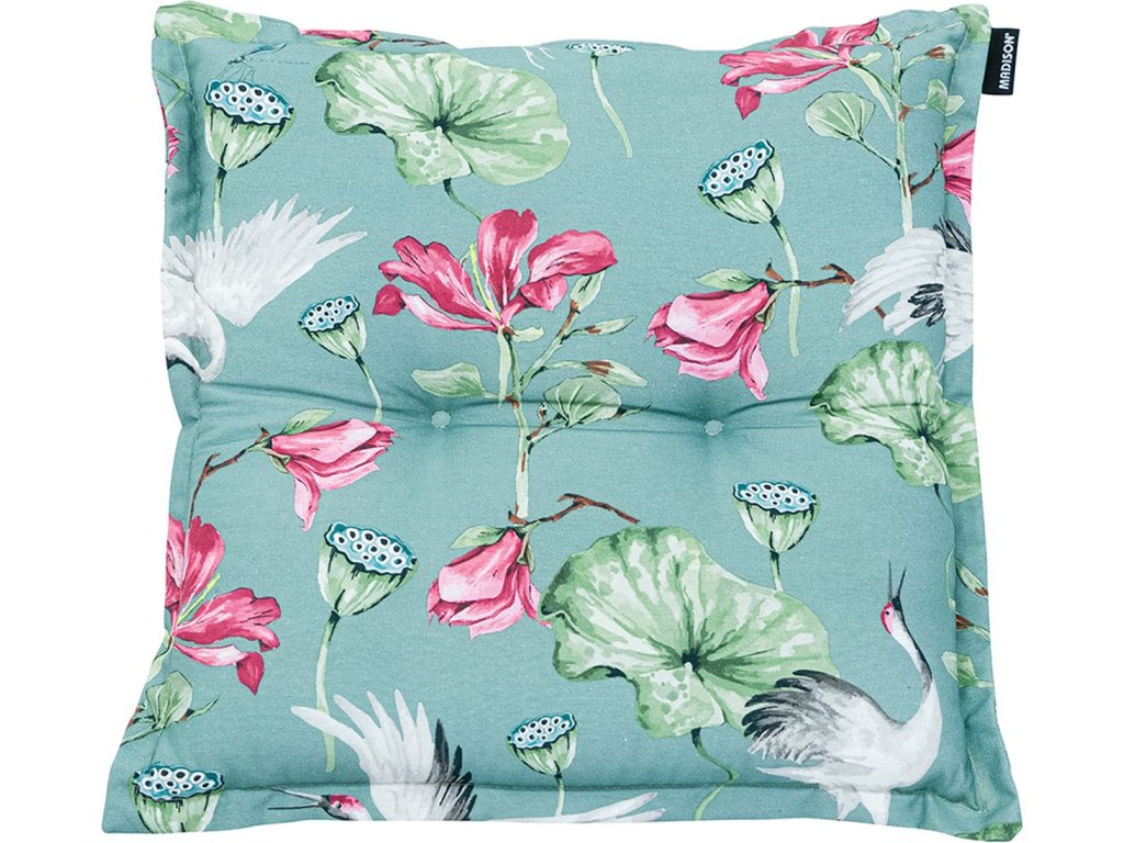 Stílusos és kényelmes Székre helyezhető párna MADISON VIEVE GREEN 50x50 cm-es méretben, kitűnő kiegészítő otthonába és kertjébe. Elegáns darumadár, lótusz és virág mintával zöld alapon. Puha párnázottsága maximális kényelmet biztosít ülés közben.