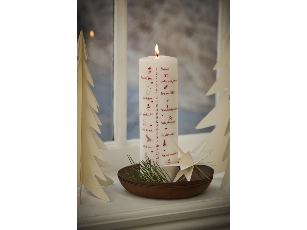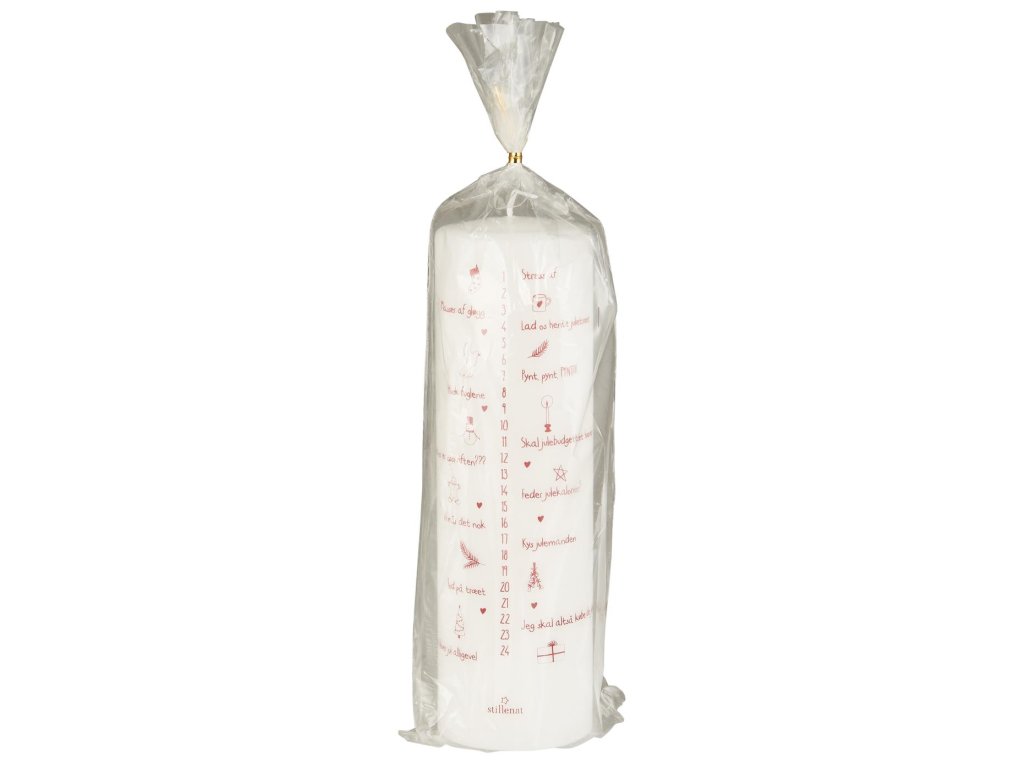 Fehér adventi gyertya számokkal és karácsonyi mintákkal