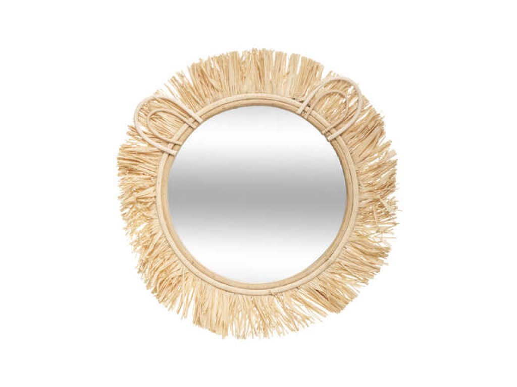 Az eredeti forma és stílusos kialakítás nagyszerű kiegészítője lesz a skandináv stílusú belső térnek. Szerelembe esni a Lion kerek tükör egyedisége raffia kerettel. Rattan test rafia díszítéssel egy kerek tükröt ölel át, amely megtalálja a helyét a fürdőszobában, a folyosón vagy a nappaliban.