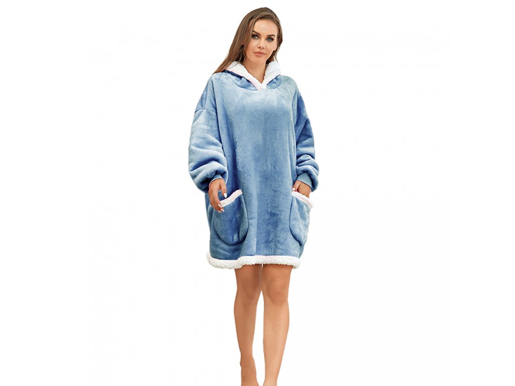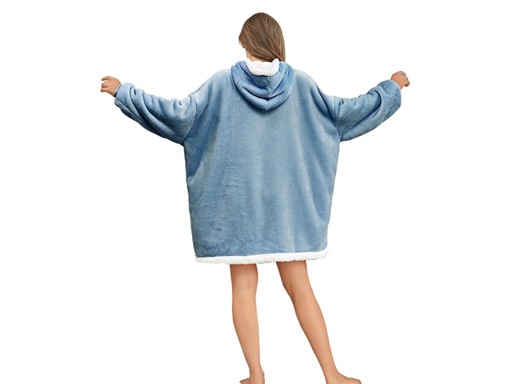 HORIZON kék báránybunda hatású kapucnis, ujjas pléd