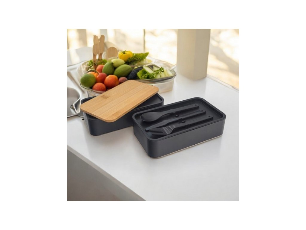 DUO LUNCH étkezési doboz evőeszközzel, fekete/bambusz